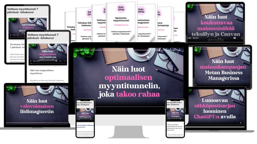 Oletko valmis nostamaan verkkokurssisi myynnin uudelle tasolle? Tässä 7 päivän tehohaasteessa rakennat älykkään, toimivan myyntitunnelin alusta loppuun – ilman turhaa säätöä ja turhaa stressiä. Opit konkreettiset stepit, joiden avulla myynti alkaa sujua fiksusti, ketterästi ja ajastetusti. Sopii erityisesti kiireisille digiyrittäjä-äideille, jotka haluavat tehdä vähemmän ja saada enemmän.